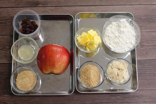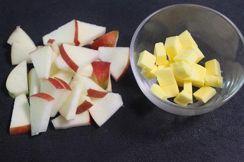 りんごは芯を除き、2?3cmの厚さのいちょう切りにする。バターは、1cm角に切り、冷蔵庫で冷やしておく。
