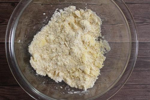 ボウルに薄力粉、バター、砂糖を入れる。指でバターのかたまりを潰しながら、薄力粉、砂糖と混ぜる。全体がポロポロのそぼろ状になるのが目安だ。ところどころ塊が残ってもOK。この時、サクサクの食感を残すため、バターが溶けてベタベタにならないように注意しよう。