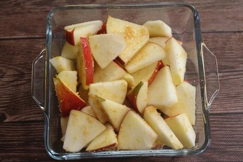 耐熱容器にりんごを入れて砂糖、レモン汁をまぶす。