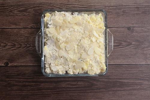 STEP2のりんごの上に、レーズンをのせる。さらに、STEP3のクランブル生地、アーモンドスライスをのせて、200℃のオーブンで30?40分程度焼く。