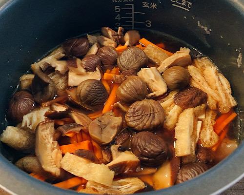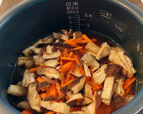 にんじん、しいたけ、油揚げを入れて、軽く混ぜておく。
