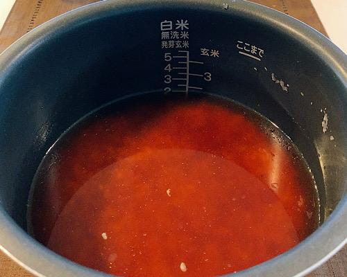 米を研いだもの、焼き豚のタレとしいたけの戻し汁を入れる。足りない分は水で補い、2合の目盛りに合わせる。