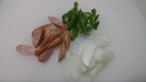 玉ねぎは皮を剥き、端を落として薄切りにする。ピーマンは端を落として種を除き、細切りにする。ウィンナーは食べやすい大きさに切る。炒めると小さくなるので、ピーマンは大きめに切った方ができあがりの見映えがよくなる。