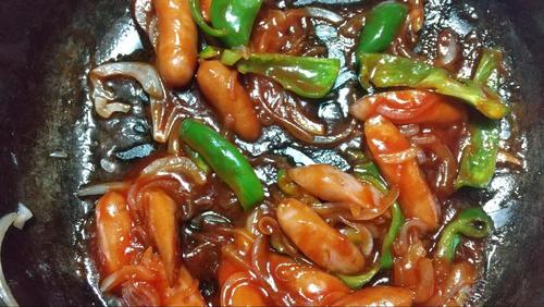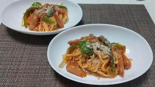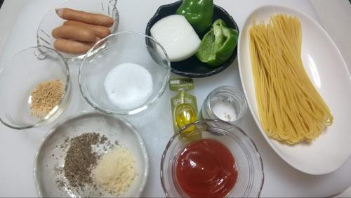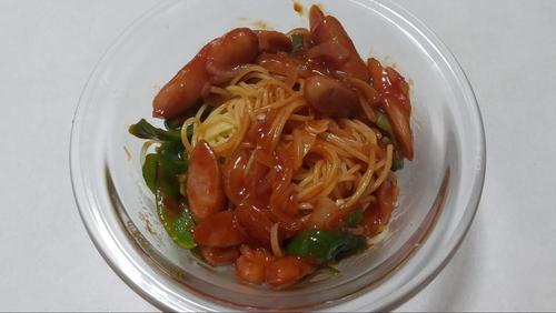 玉ねぎ、ピーマン、ウィンナーを全てフライパンに入れてオリーブオイルで炒める。おおかた火が入ったところで、ケチャップ、コンソメ顆粒、砂糖、塩胡椒を入れてさらに炒める。ケチャップの香りが出てきたら火を止める。