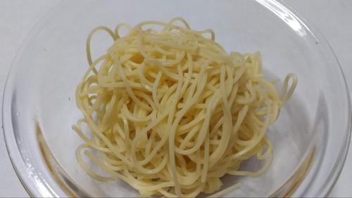 パスタは規定の時間通り茹で、流水にさらして水を切っておく。パスタは通常、茹で上がった後で流水にさらさない。しかし、今回はしっかりパスタを冷ましたいことと、サラッとさせたいことから、流水にさらしておこう。しっかり水を切り、冷やしておくことがポイントだ(水が残っている場合は、ペーパーで抑える)。