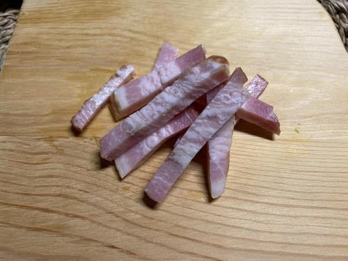 ベーコンは5mm?1cmほどの幅に切る。少し大きめに切ることで食べ応えがあり、食感も楽しめる。