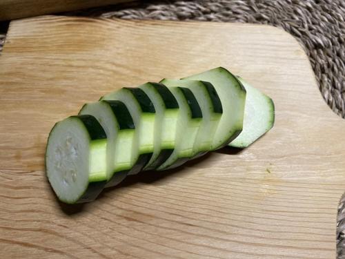 ズッキーニは端を落として3本線で皮を剥き、1cmほどの厚さにスライスする。
