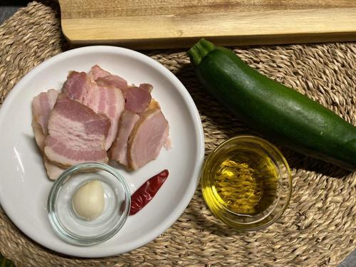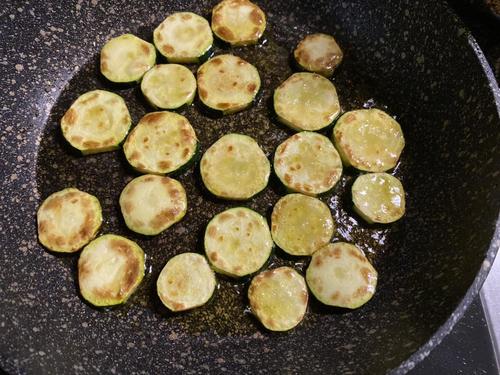 フライパンにオリーブオイル、にんにく、鷹の爪を入れて弱火にかけ、にんにくが色づいてきたらズッキーニを並べる。片面にこんがり焼き目がついたら裏返し、両面に焼き目をつける。