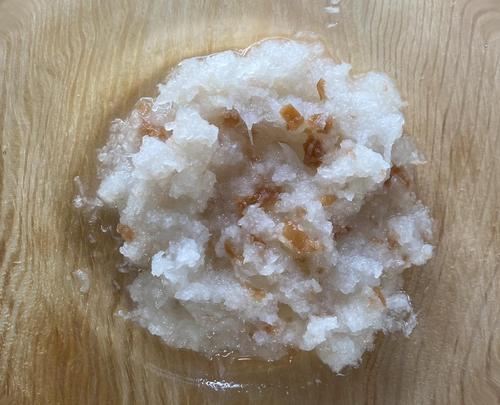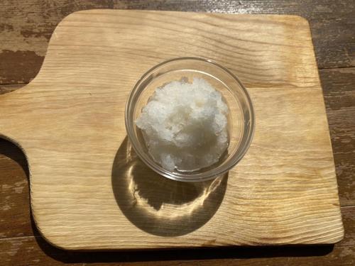 大根は薄く皮をむき、おろし金でおろす。大根おろしは水分があるので、軽く絞って水気をきっておく。