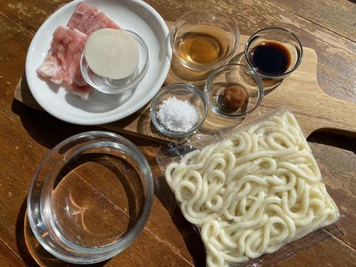 うどんを2分程茹でて丼ぶりに盛り付け、うどんつゆを注ぐ。茹でた豚肉を中心に盛り、大根おろしと梅肉を合わせた梅おろしをトッピングする。
