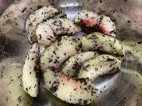 アールグレイをすり潰して細かくし、桃にかける。よく混ぜる。