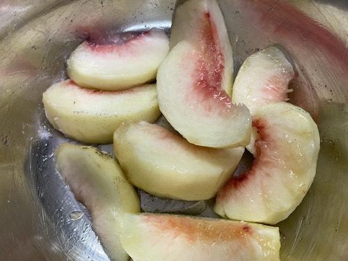 ボウルに桃を入れ、砂糖をかけて全体に和える。
