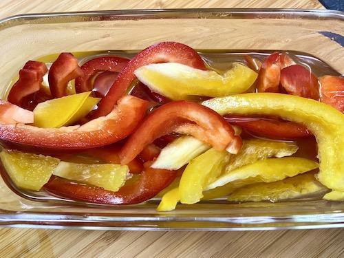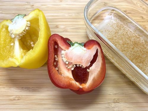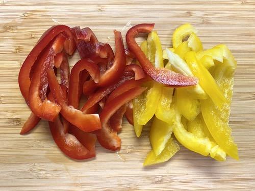 パプリカの種を取って、食べやすい大きさの細切りにする。
