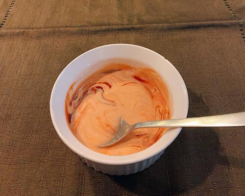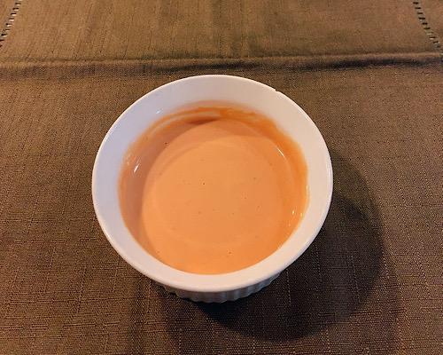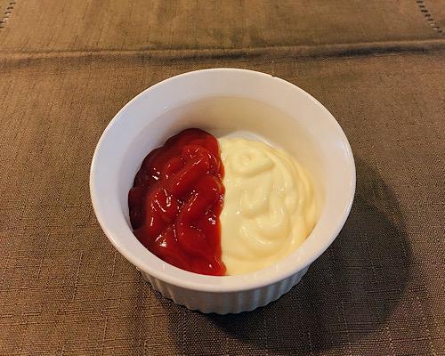 スプーンなどを使用して、マヨネーズとケチャップをしっかりと混ぜ合わせる。混ぜムラがあると味に違いが出てしまうので、注意が必要である。