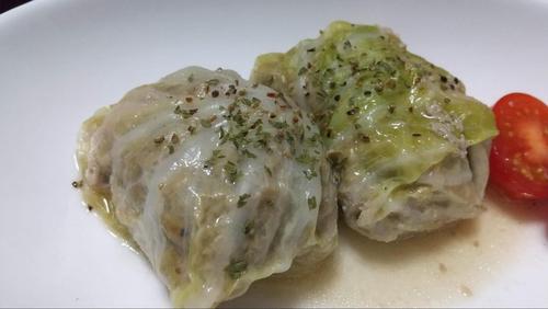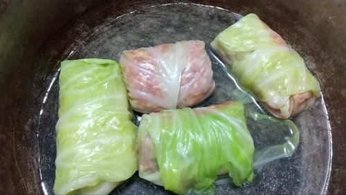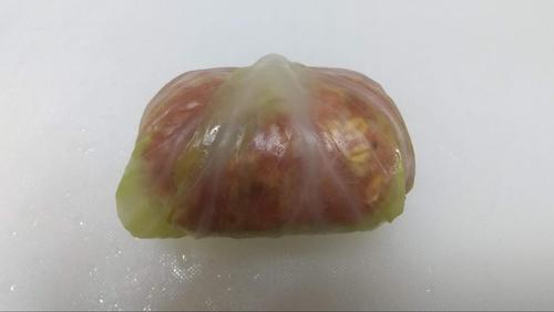 肉ダネをキャベツの中心に置く。両端を畳んでから、下からくるっときっちり丸める。
