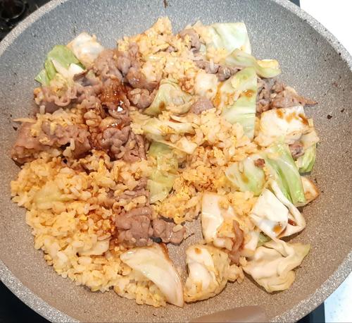 キャベツに火が入ったら、卵・冷や飯を入れて1分ほど炒め、牛バラ肉を入れる。焼肉のタレと酒を回しかけて20秒ほど炒めたら、お皿に盛り付けて完成。