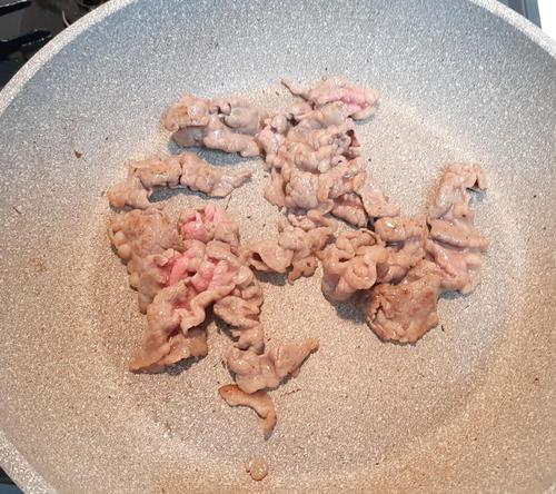 Step.2 カットした牛バラ肉を、フライパンでさっと焼く
