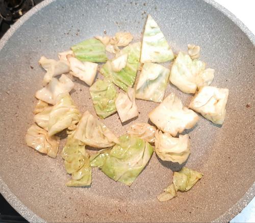 一辺4~5cmほどに切ったキャベツを、フライパンに入れて中火で炒める。