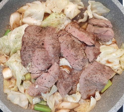 STEP.1の牛ロース肉を斜めに薄切りにする。フライパンに加え、さっと絡める。お皿に盛り付けて、粗びき黒胡椒をかけて完成。お好みで刻みネギ適量(分量外)をトッピングしてもよい。