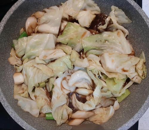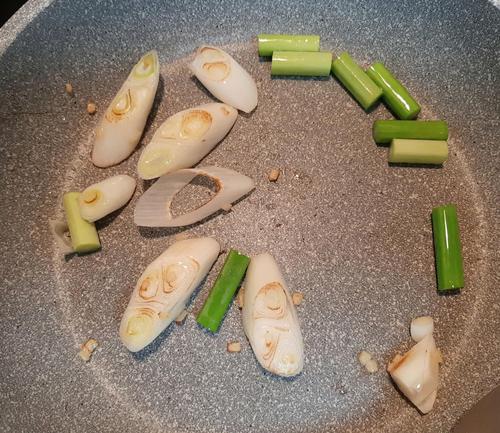 生姜は粗みじん切り、白ねぎは斜め切り、ニンニクの芽は3cm長さに、キャベツは一辺が4~5cmの大きさにカットする。フライパンに生姜、白ねぎ、ニンニクの芽、キャベツを入れ、中火で1分程度炒める。