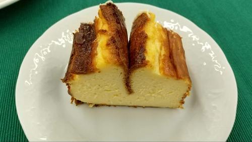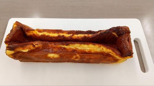 あらかじめ220℃に予熱しておいたオーブンに入れ、45分間焼く。バスクチーズケーキなので焼き色が濃く付くが失敗ではない。でき立ては膨らんでいるが、冷めてくるとしぼむ。