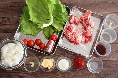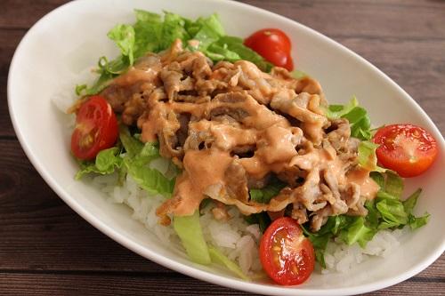 器にごはんを盛り、レタス、プチトマトをのせる。豚肉をのせ、ソースをかけたら完成だ。