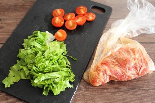 レタスはせん切りにし、プチトマトはヘタを取り除いて半分に切る。豚肉は●の調味料とともにビニール袋に入れ、よく揉みこんで下味を付ける。ビニール袋で下味を付けると洗い物も少なくて便利だ。