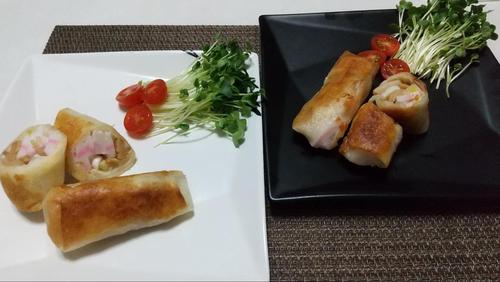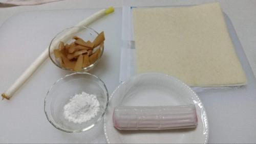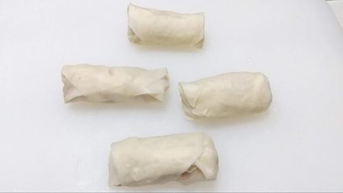 STEP1を4等分にして春巻きの皮で巻く。巻き終わりは、小麦粉を水で溶いた糊を塗って止める。170℃の油で3分程度揚げ、小麦色にカリッとなったら完成。