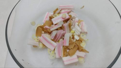 長ネギ、メンマ、なるとをボウルに入れて混ぜ合わせる。
