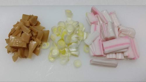 長ネギは小口切り、メンマは3cm程度のぶつ切り、なるとはメンマと同じくらいの大きさに切る。