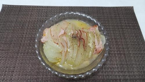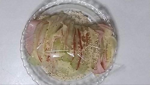 耐熱容器に冬瓜、ハム、スライスチーズを交互に並べていく。最後に顆粒出汁を入れて胡椒を振る。ラップをかけて700Wの電子レンジで10分加熱する。