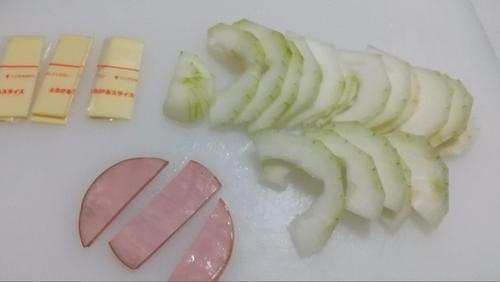 冬瓜は皮をむき、ワタとタネを取って1cm程度の厚さに切る。冬瓜の大きさに合わせるように、スライスチーズとハムを3等分程度に切る。冬瓜、ハム、スライスチーズの順で並べることを想定して枚数を合わせて切るとよい。