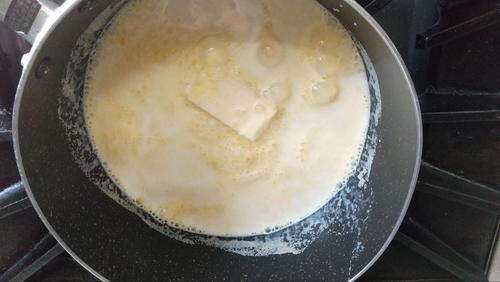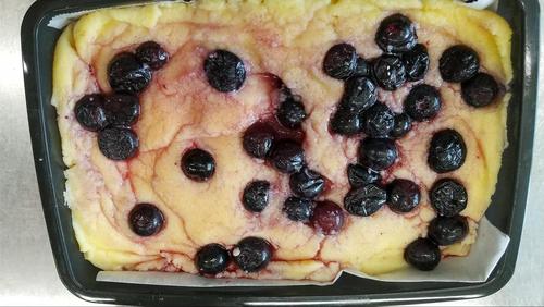 ぽってりとしてきたら火からおろす。あらかじめ用意しておいた容器に入れて、上にブルーベリーを乗せる。自然と固まってくるので、粗熱が取れたら好きな大きさに切り分ける。