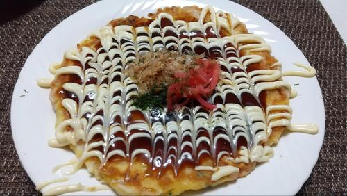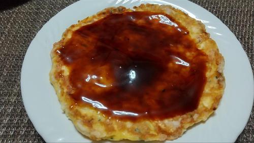 焼けたお好み焼きを皿に乗せてお好みソースをたっぷりぬる。