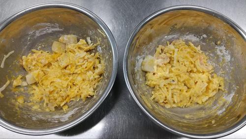 全ての材料を、2つのボウルに半分ずつになるように分けて入れ、よく混ぜ合わせる。1つのボウルで作るより、最初から2枚分に分ける方が失敗なく上手にできる。