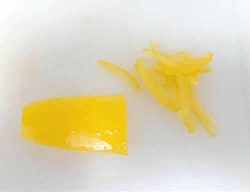 パプリカを縦4~5cmにカットする。横に向けて、繊維に逆らうように薄くスライスする。