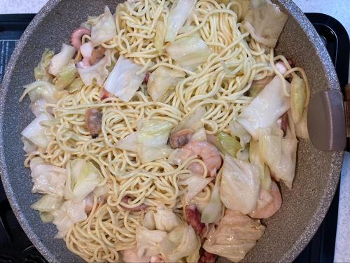 焼きそば麺をほぐし入れ、中火で2分程加熱したらお皿に盛り付ける。