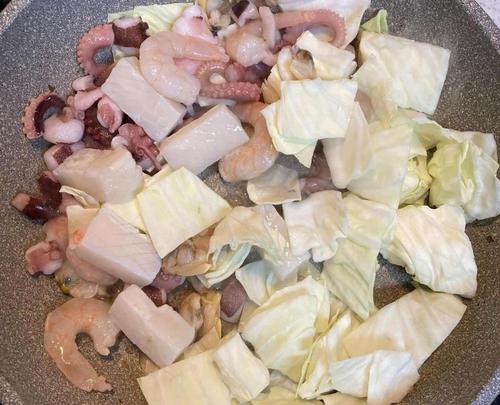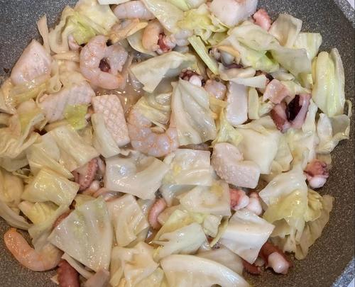 Step.1 キャベツとシーフードを炒める