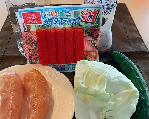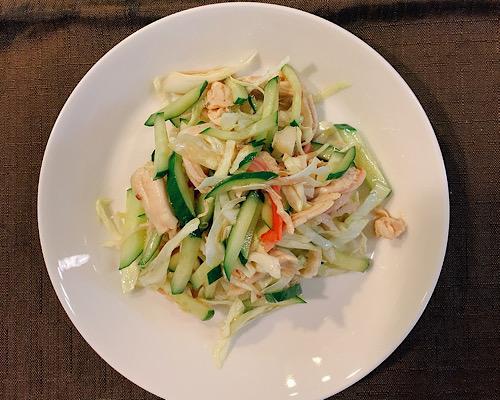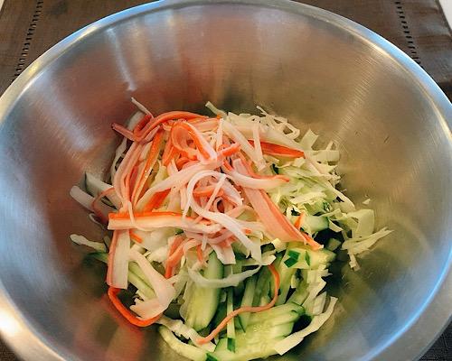 キュウリは端を落として細切りにする。キャベツは芯を除いてせん切りにする。カニカマはほぐしておく。これらを大きめのボウルに入れて、合わせる。