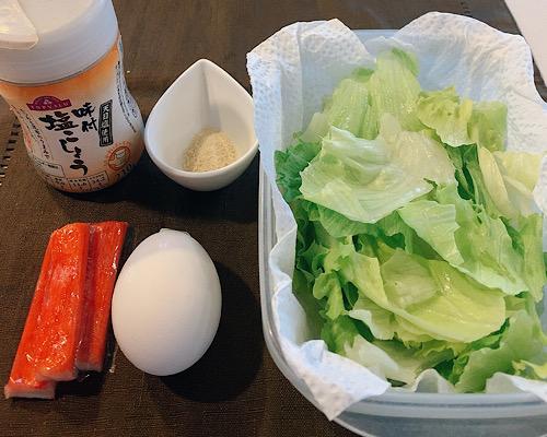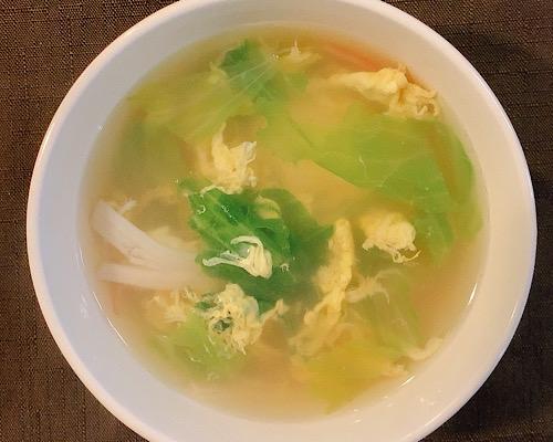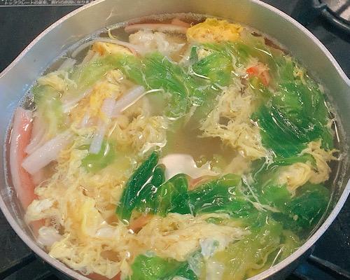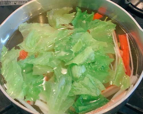 鍋に水を2カップ程度入れて、沸騰させる。そこに一口大にちぎったレタスと、ほぐしたカニカマを加える。さらに、鶏がらスープの素を加えて味をつけて、塩コショウで調整する。