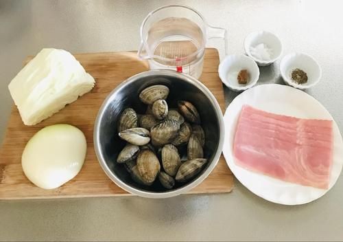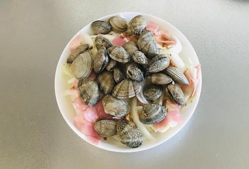 耐熱容器か深めのお皿にキャベツと玉ねぎ、ベーコンを入れる。その上にあさり、コンソメキューブをのせラップをする。600Wの電子レンジで7分加熱する。あさりの口が開いていたらよい。まだ閉じているようであれば1分ずつ追加で加熱する。