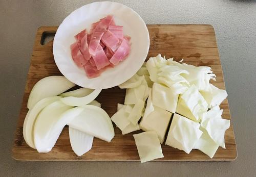 キャベツは芯を除き、食べやすい大きさにざく切りにする。玉ねぎは皮を剥いて端を落とし、繊維に沿って、1cm幅のくし切りにする。ベーコンも1cm幅に切る。