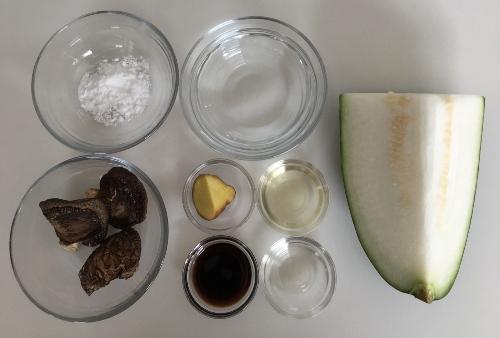 冬瓜はワタをとって皮をむき、1cm幅に切る。しょうがは皮を剥いてすりおろし、キッチンペーパーで絞る。干ししいたけはやわらかくなるまで水で戻す。