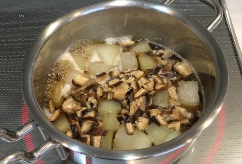 鍋に干ししいたけの戻し汁を入れ、弱火で冬瓜を5分煮る。その後、しょうゆ、みりん、酒、干ししいたけを入れさらに5分煮る。仕上げにしょうが汁を入れ再度沸騰させたら、水溶き片栗粉でとろみをつける。器に盛りつければ完成だ。