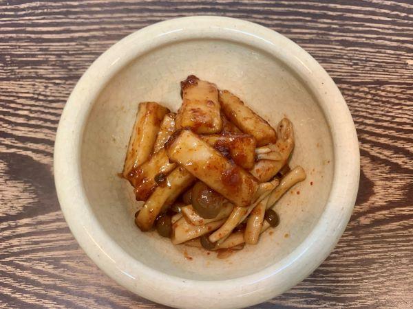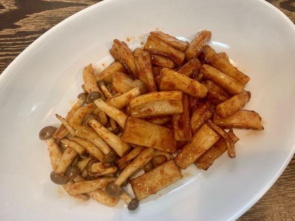 れんこんを炒めたフライパンにぶなしめじ、取り分けておいた出汁汁を加えて炒める。