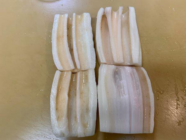縦に切ってみると分かるが、れんこんは穴の周りが結構汚れていることがある。黒い汚れがある場合は、スプーンを使ってこそげ取っておく。