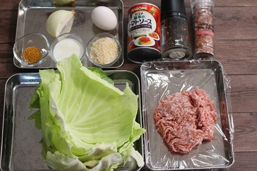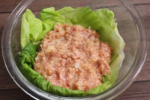 玉ねぎは皮を剥いて端を落とし、みじん切りにする。キャベツは芯の部分に切り込みを入れる。切り込みを入れることで、芯の固さが和らぐ。キャベツを耐熱容器にのせ、ラップをかけて600Wの電子レンジで3分程加熱する。キャベツが柔らかくなったら、ラップをはずし、粗熱を取る。