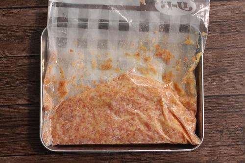 ビニール袋やジッパー付きの保存袋に豚ひき肉、玉ねぎ、パン粉、牛乳、顆粒コンソメ、ナツメグを入れて、揉みこむように全体を混ぜ合わせる。