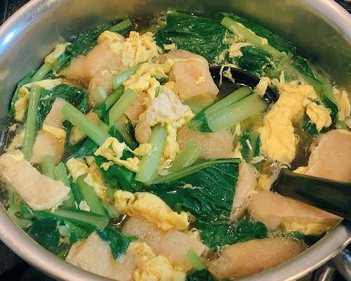 3cm幅程度に切った小松菜を、火が通りにくい茎から順番に入れていく。