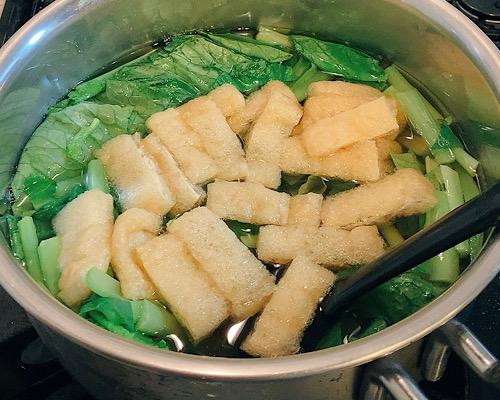 油揚げは熱湯をくぐらせて油抜きしてから、短冊切りにして、鍋に加えていく。